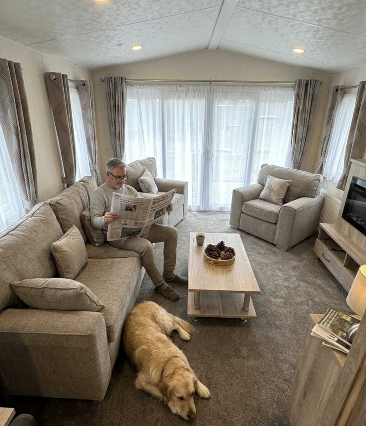 A generous wrap-around sofa provides plenty of seating for family and guests, perfectly positioned to enjoy the outlook through the full-height front patio doors. The contemporary TV unit with shelving adds practical storage while maintaining a clean, modern look.