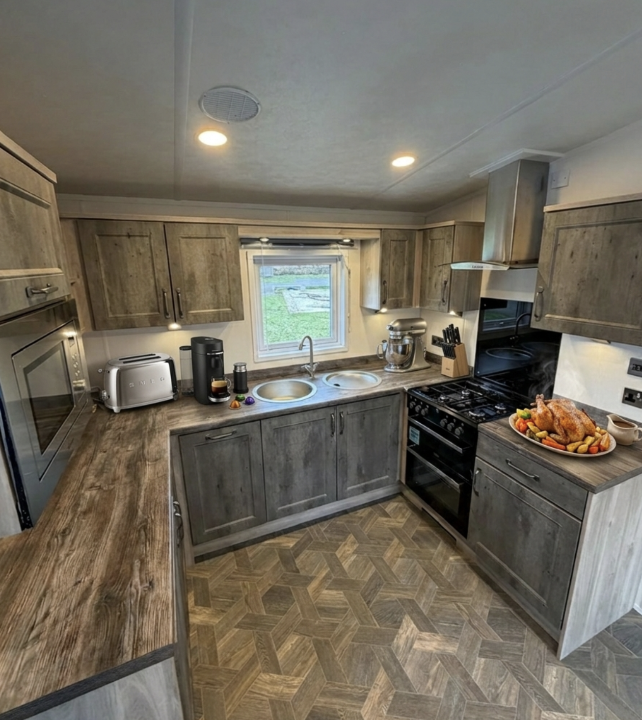 The stylish shaker-style kitchen combines cream cabinets with contrasting darker base units and wood-effect worktops. Fully equipped with integrated microwave, cooker with hob and extractor, and ample cupboard space, it’s both practical and attractive.