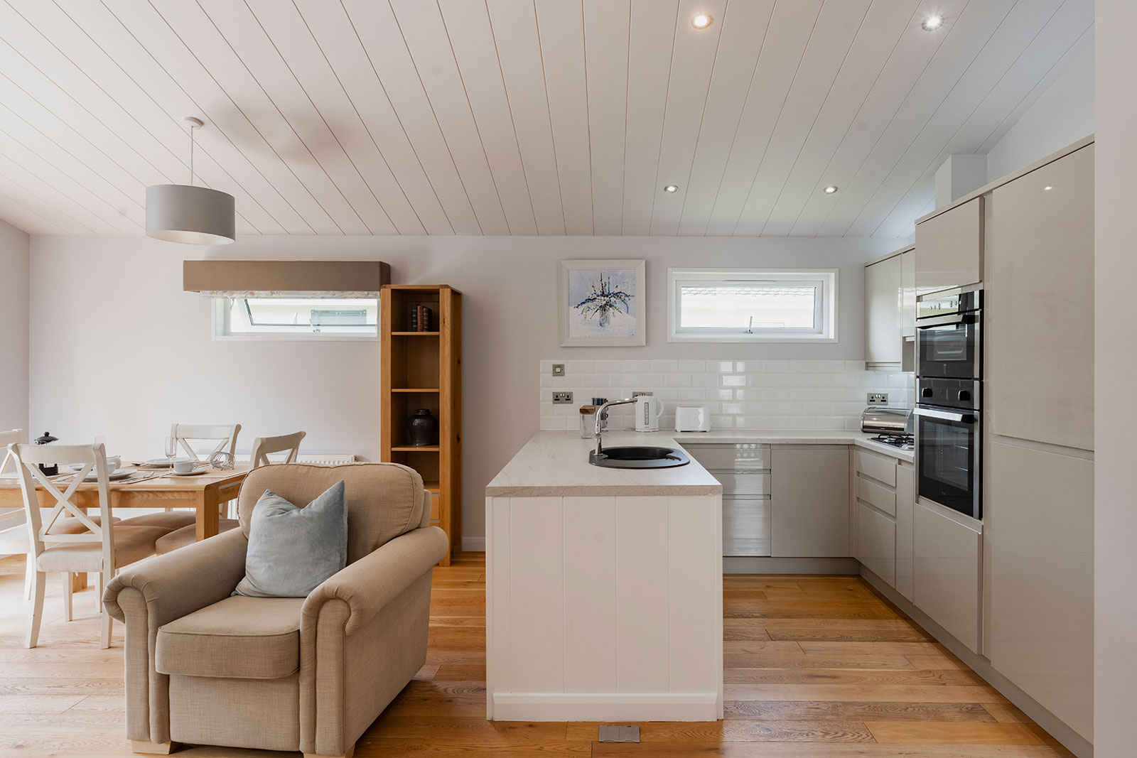 It is furnished with a comfortable two seater sofa and a single armchair, perfect for relaxing. The area seamlessly flows into the dining and kitchen space, creating a bright and airy feel.